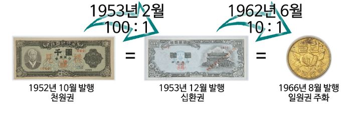 - 한국 : 1962년, 대한민국은 화폐 단위를 “환”에서 “원”으로 변경하며 리디노미네이션을 시행한 바 있습니다.